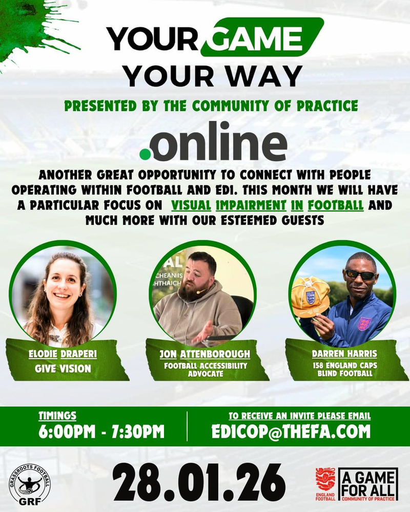 The first "Your Game Your Way" session of 2026 has a fantastic panel discussing visual impairment in football, including Elodie Draperi, Jon Attenborough, Darren Harris and Alan March.