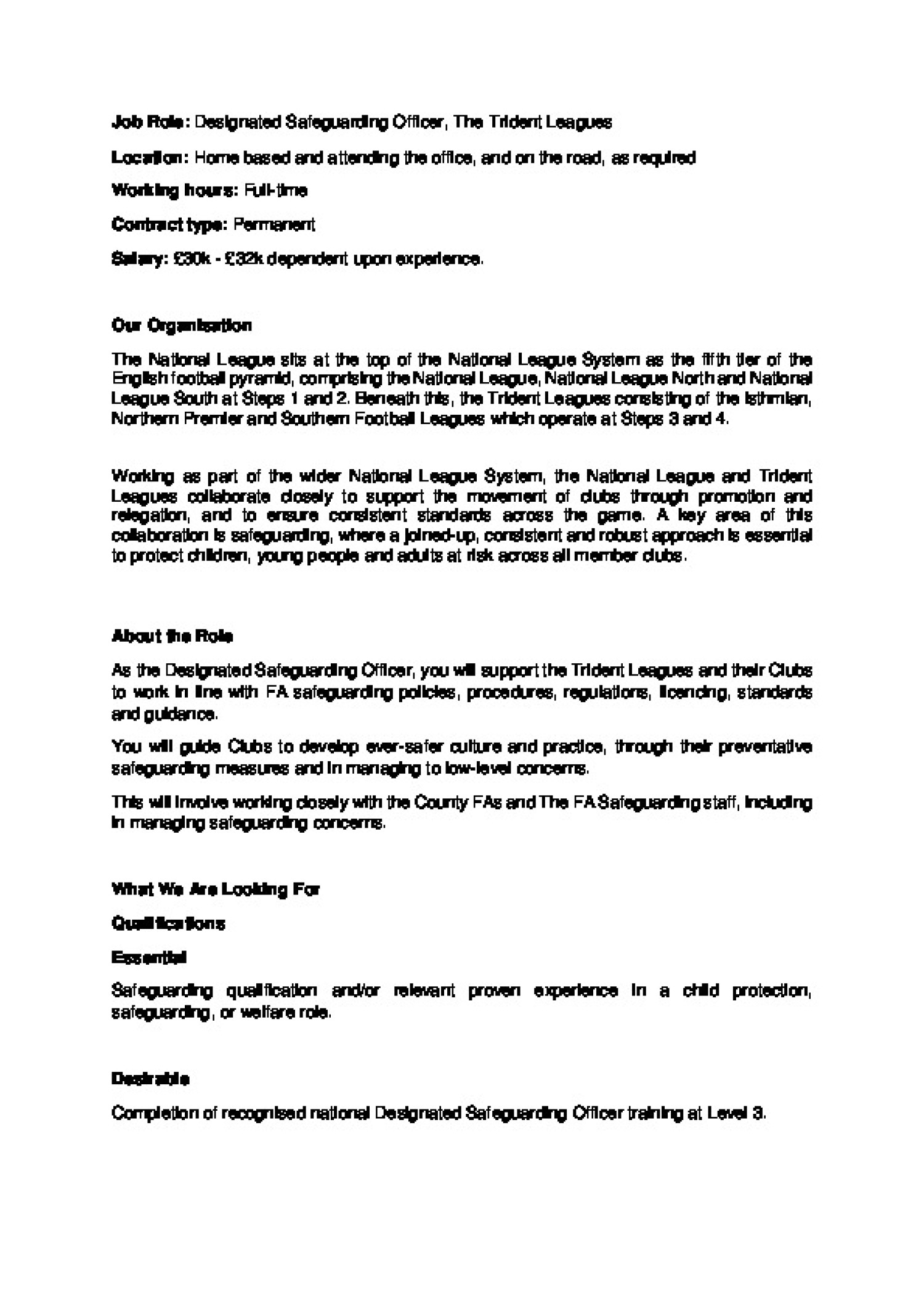 The Trident Football Leagues (Isthmian League, Northern League & Southern League) are seeking a passionate and experienced Designated Safeguarding Officer to lead and strengthen safeguarding standards across Steps 3 and 4 of the National League System.